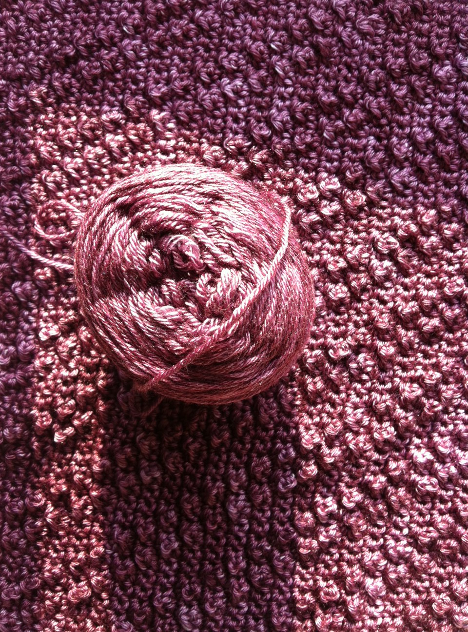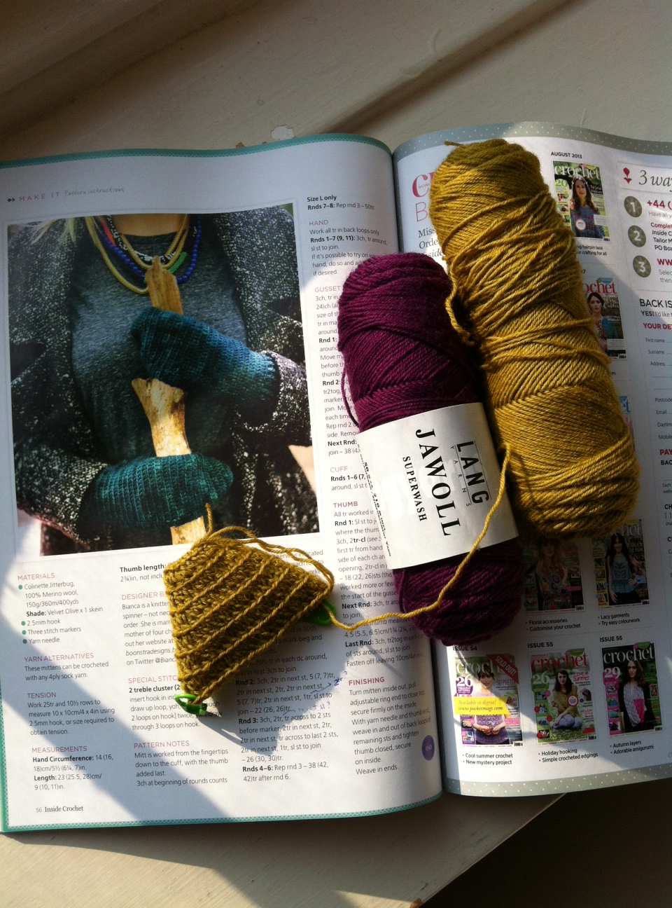 I also started working on a pair of mittens that I found by Bianca Boonstra on the last issue of Inside Crochet. I am using that Jawoll yarn I bought in the Edinburgh Yarn Crawl, I think I am doing the tip on the mustard colour and the rest in the nice pink/purple one.