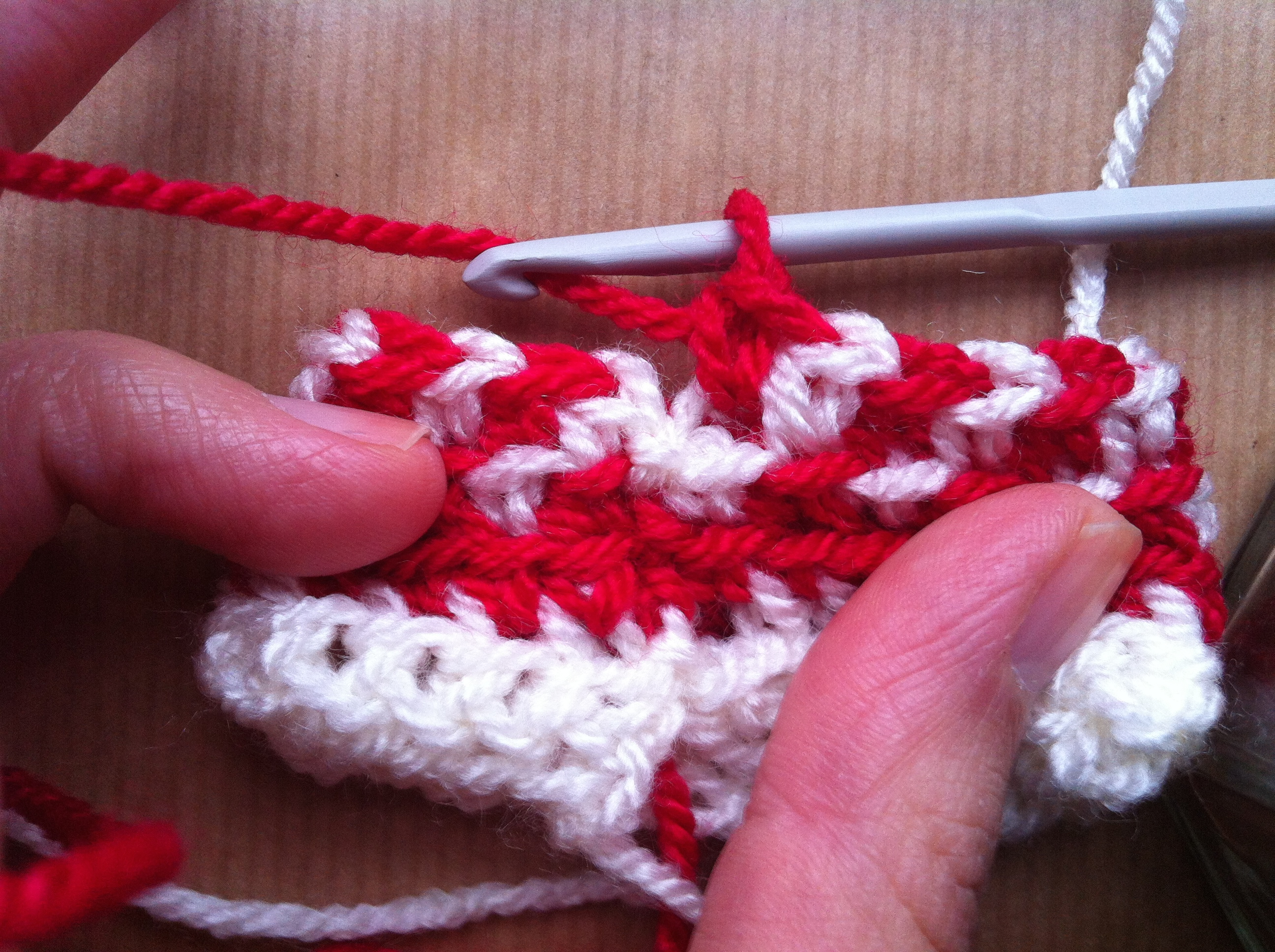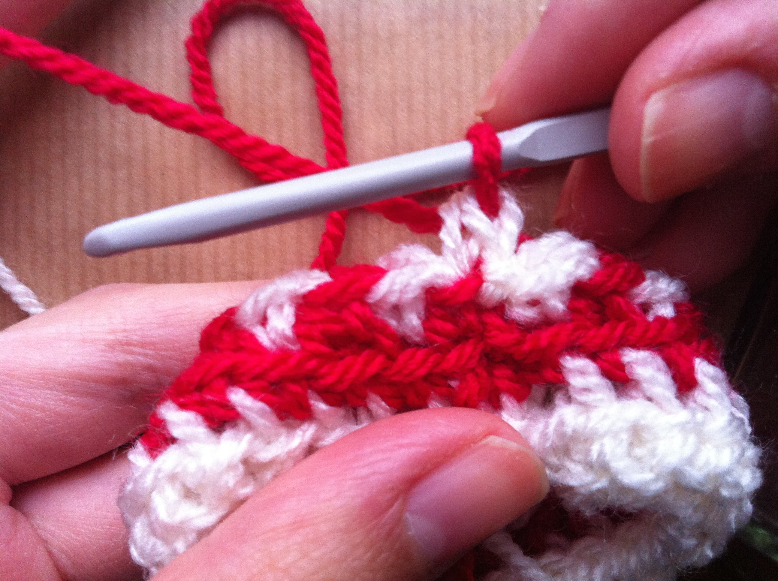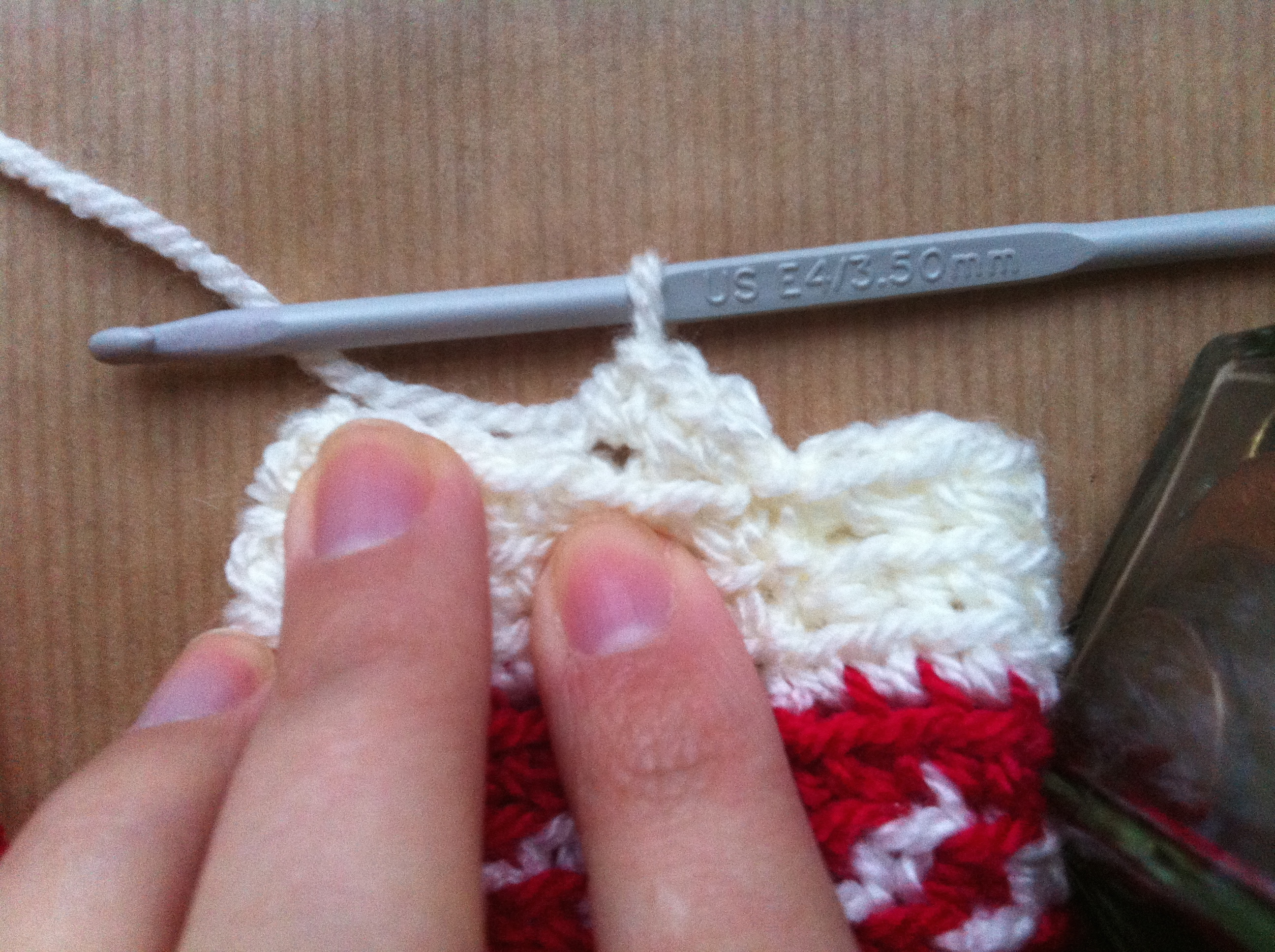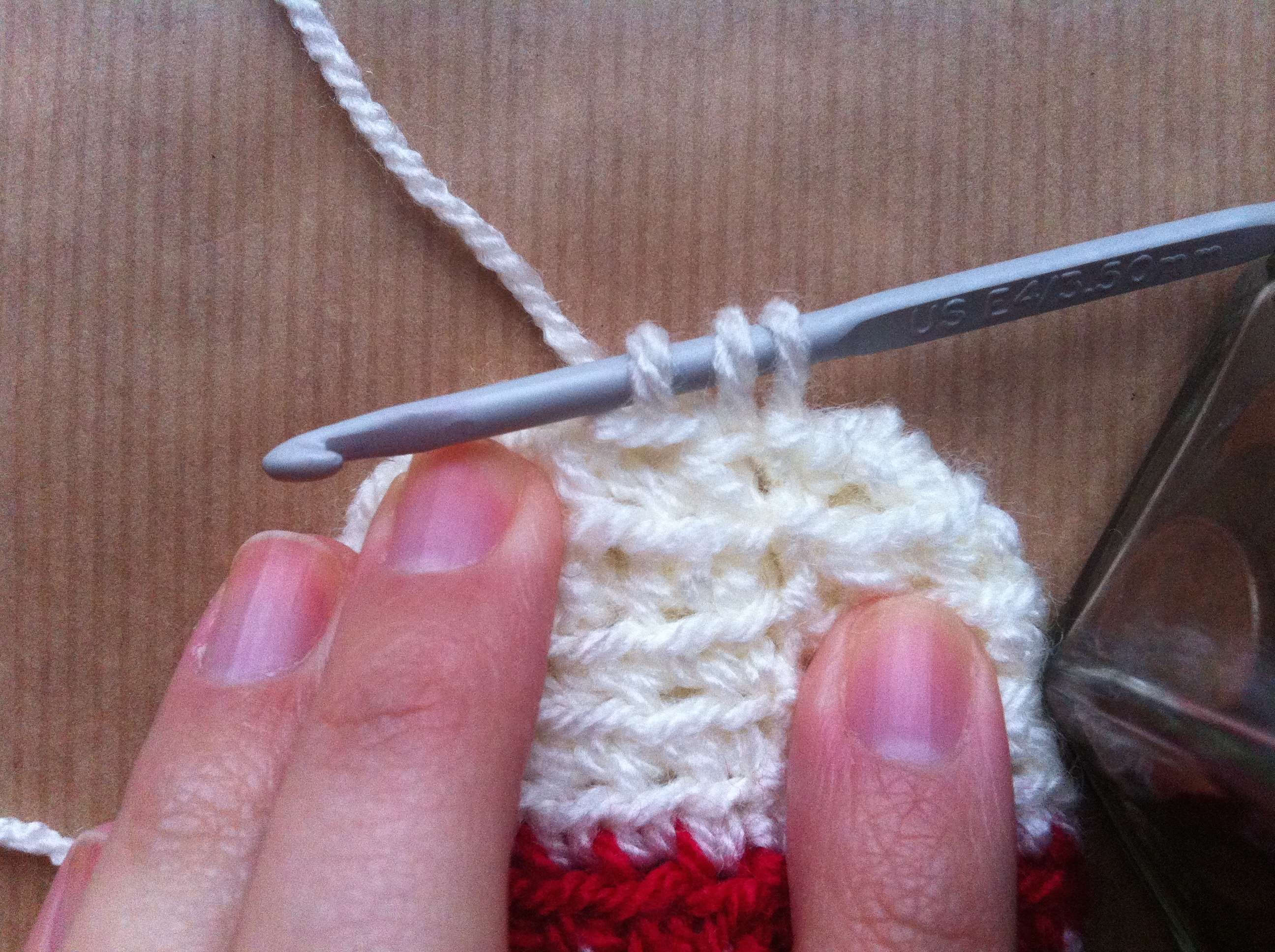 dc2tog: insert hook in stitch, yarn over and pull up a loop, insert hook in next stitch, yarn over and pull up a loop, yarn over and pull through 3 loops on hook.