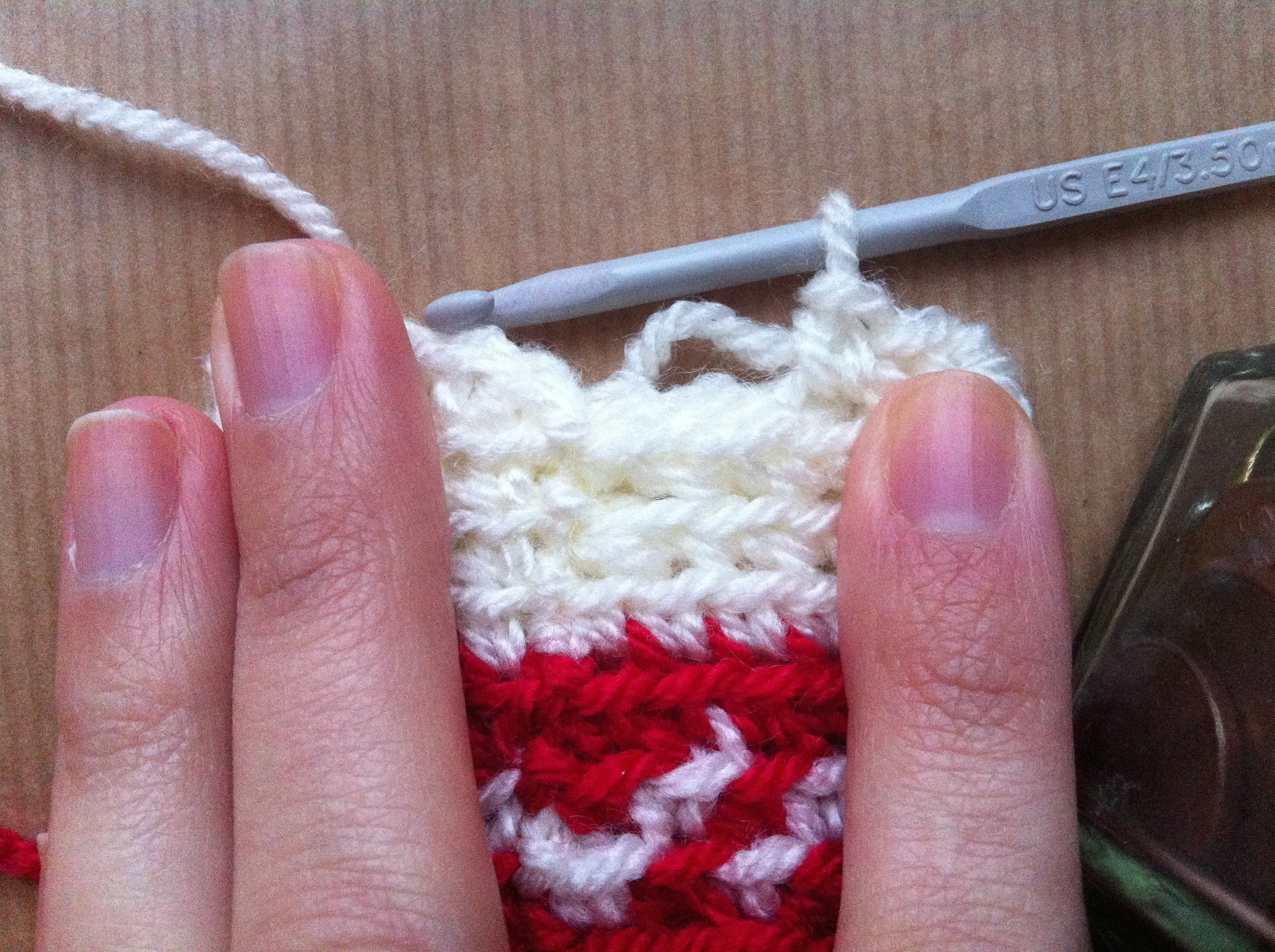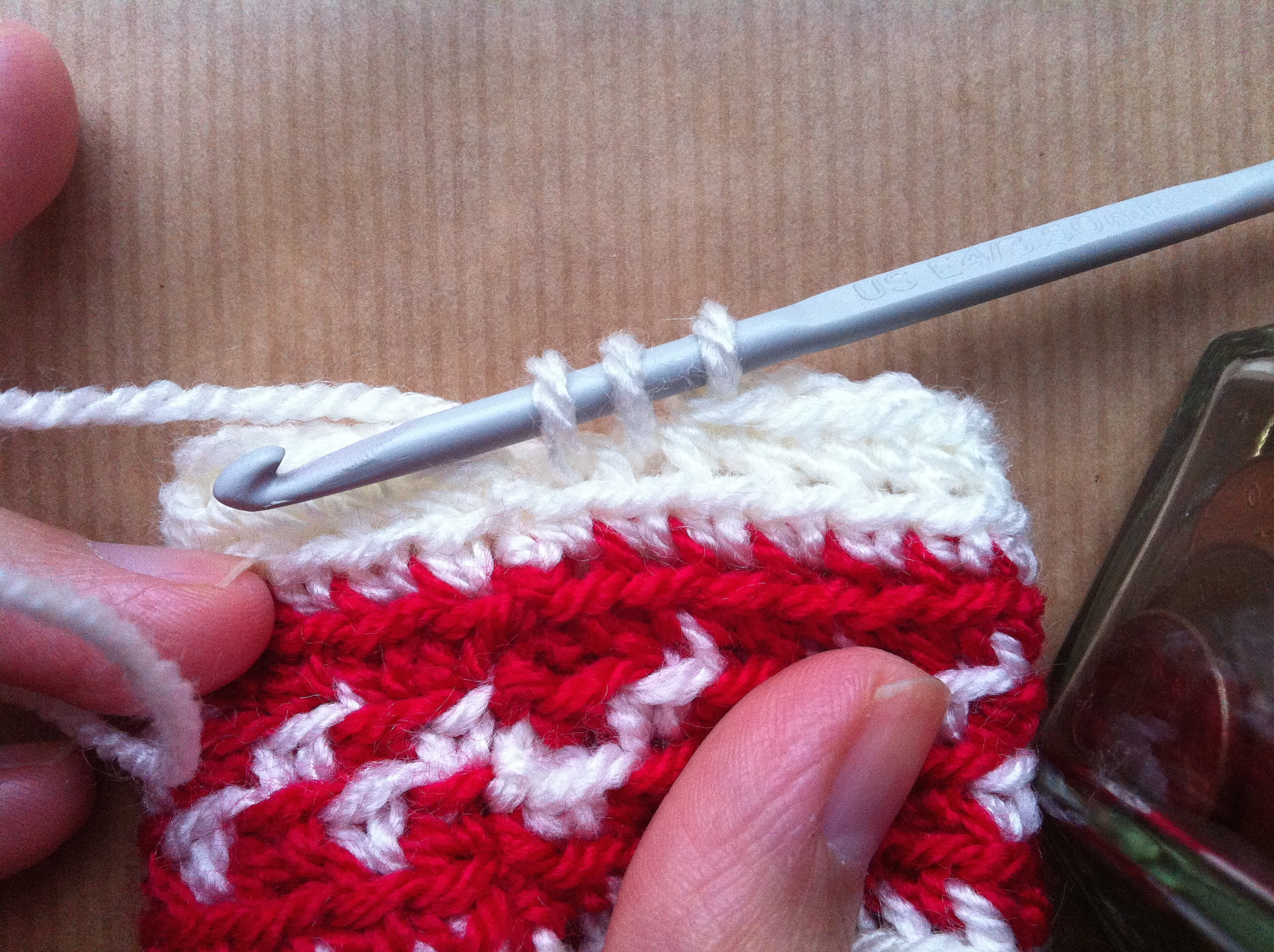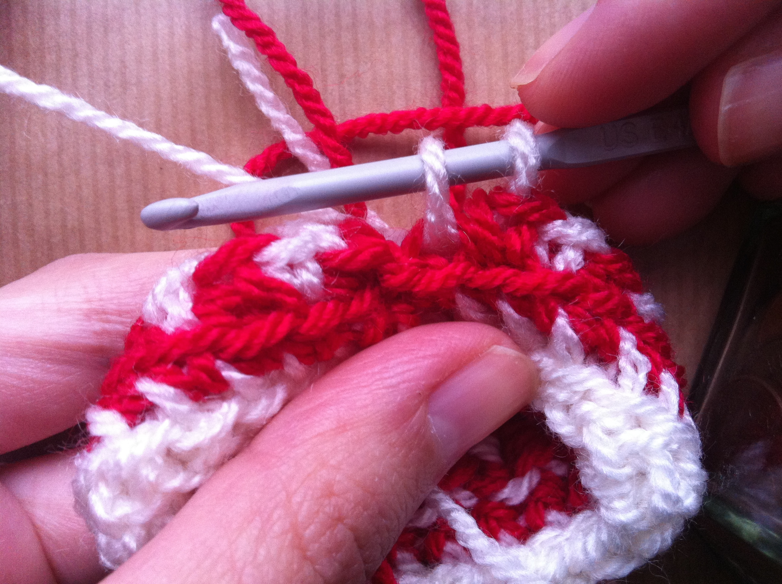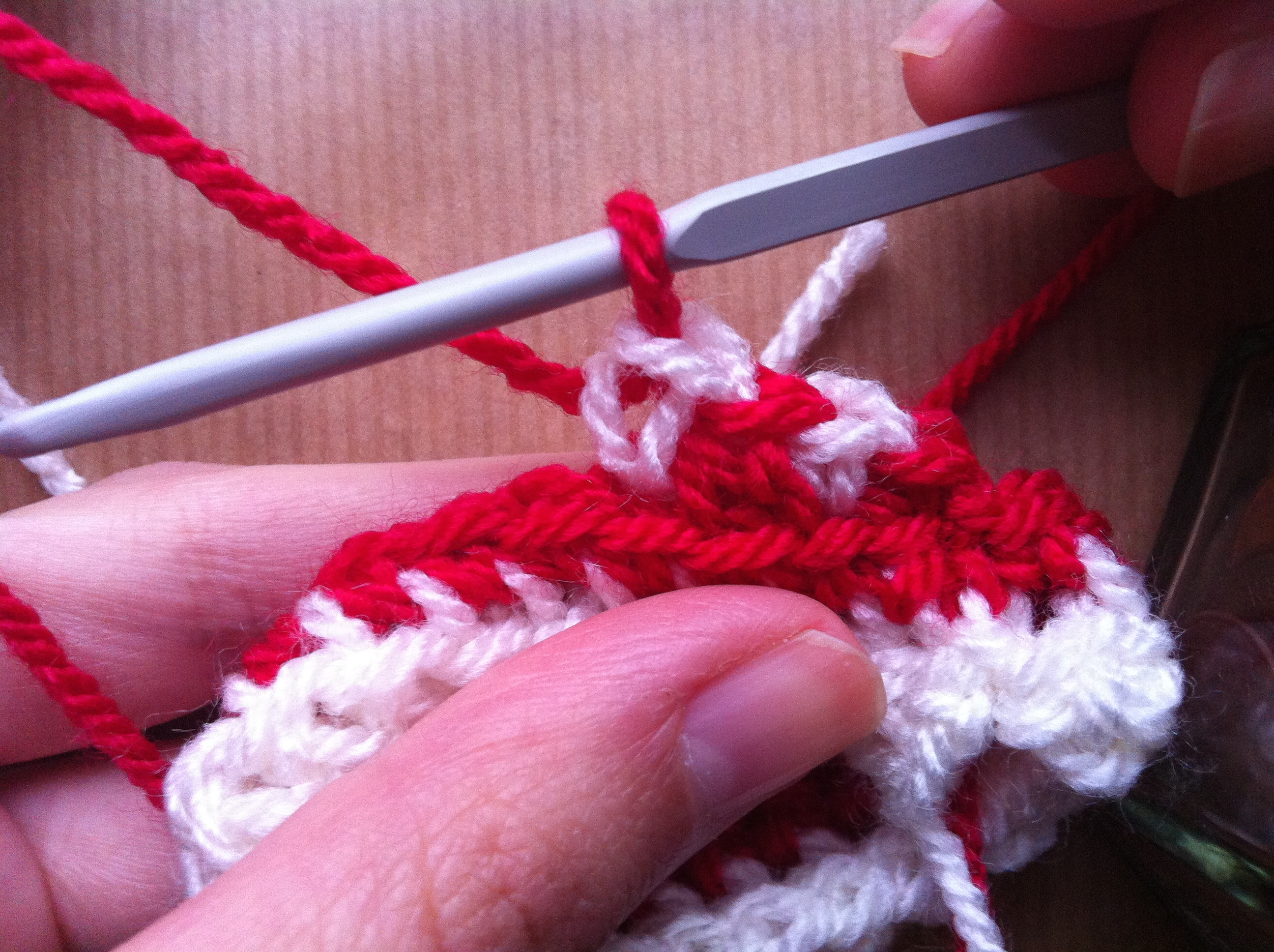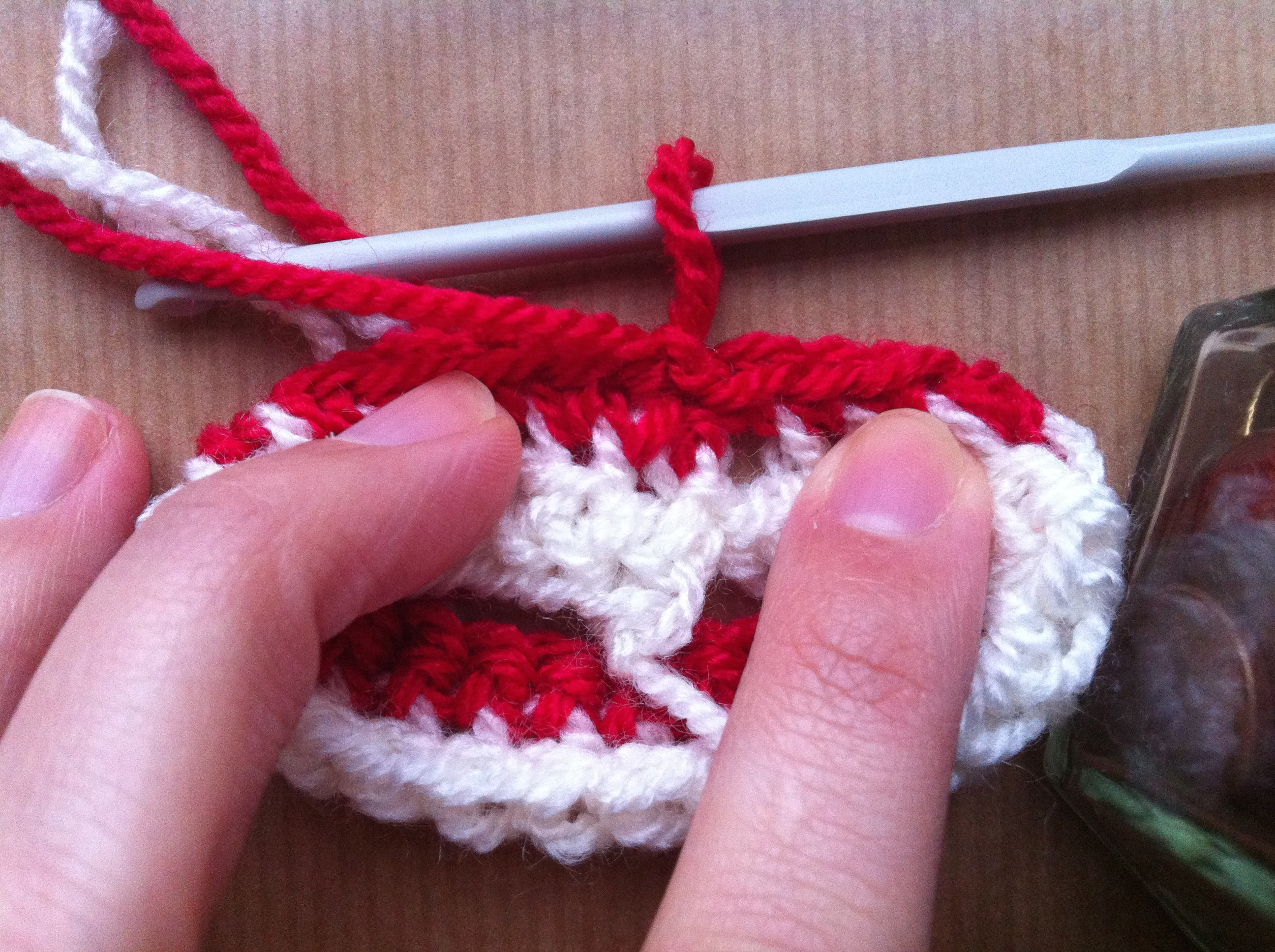 dc2tog: insert hook in stitch, yarn over and pull up a loop, insert hook in next stitch, yarn over and pull up a loop, yarn over and pull through 3 loops on hook.