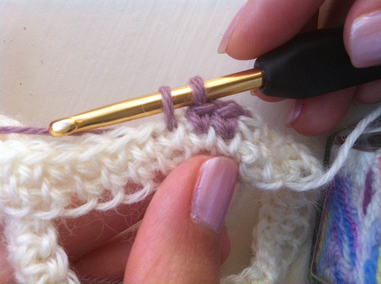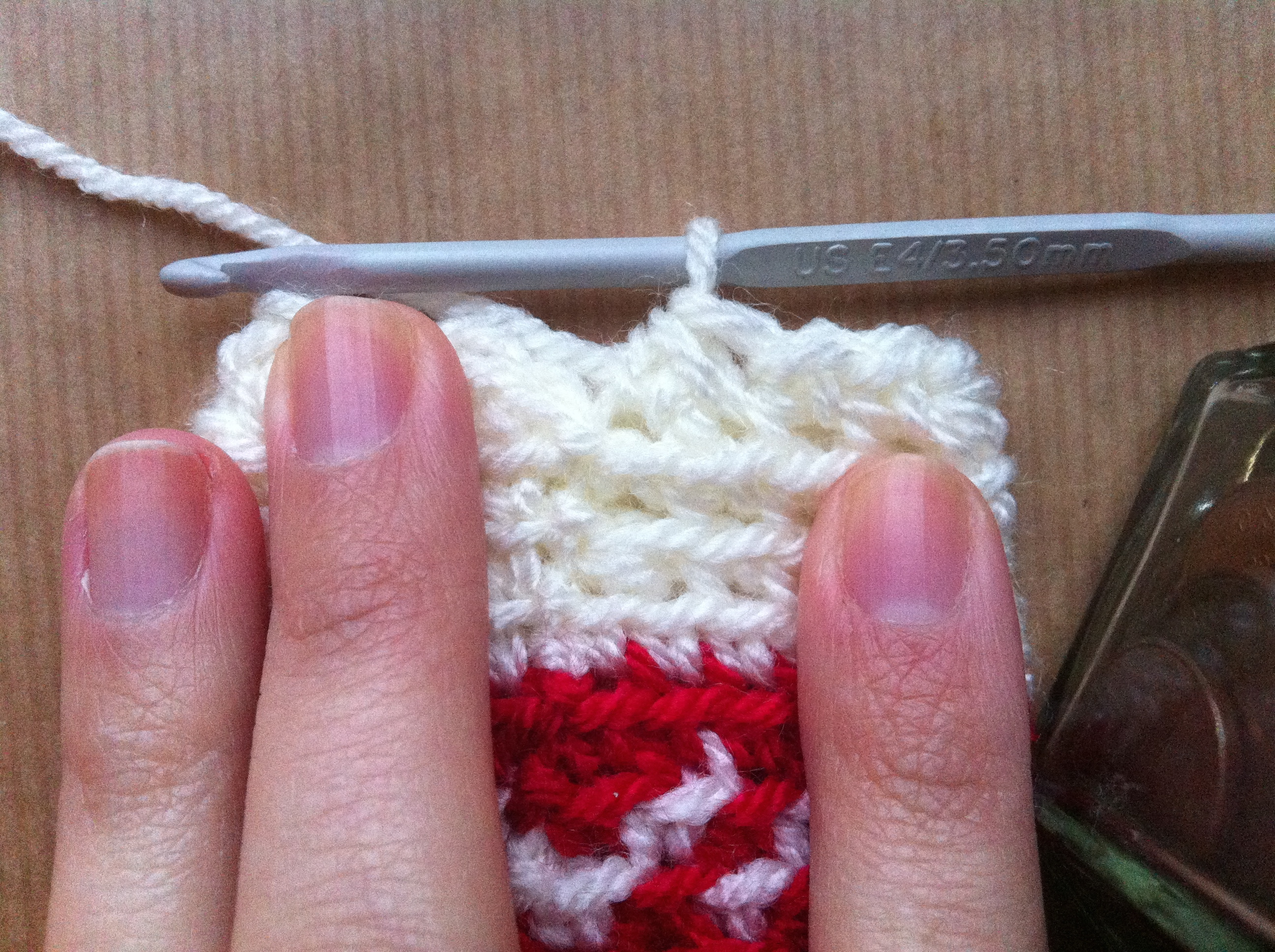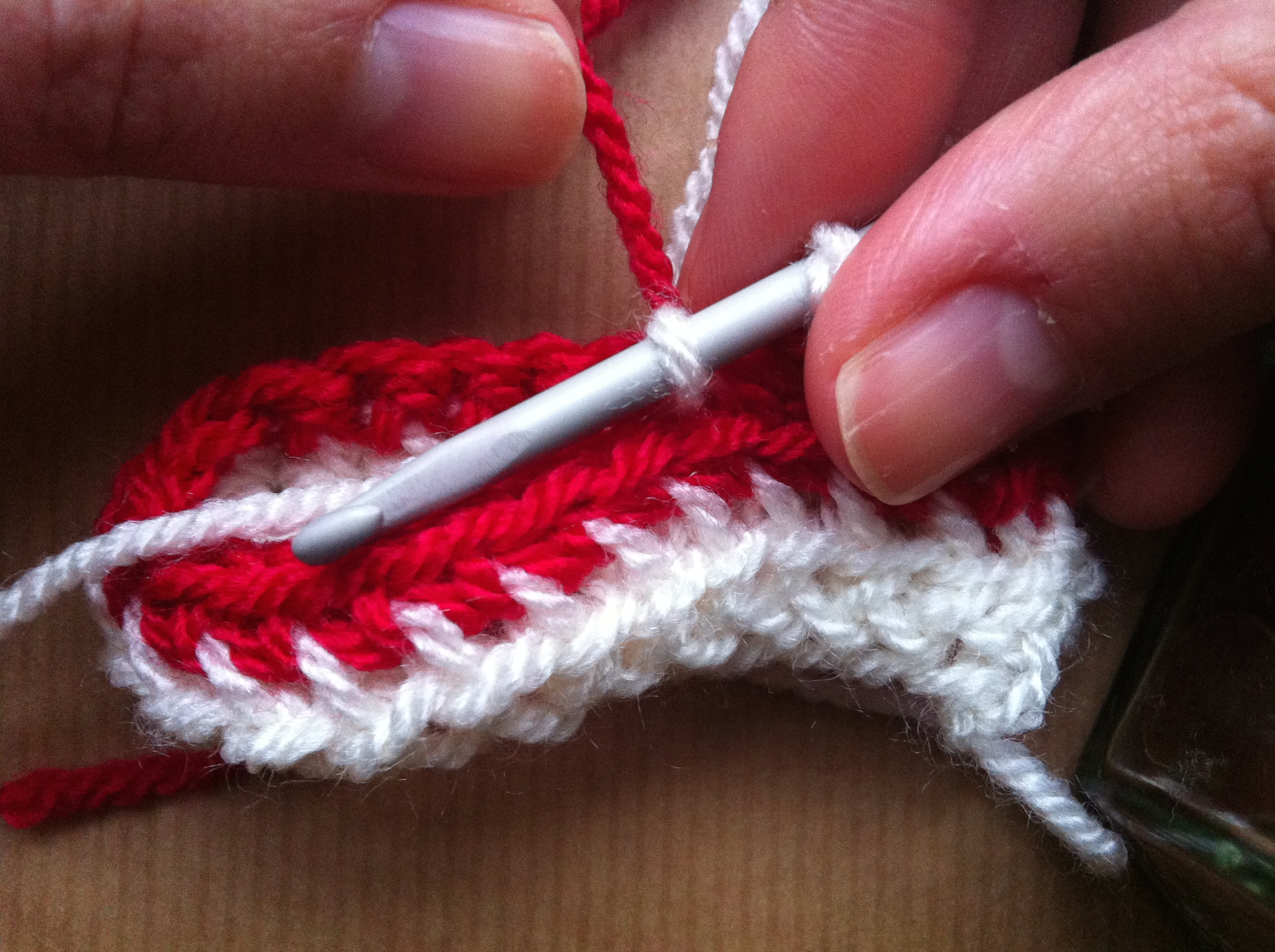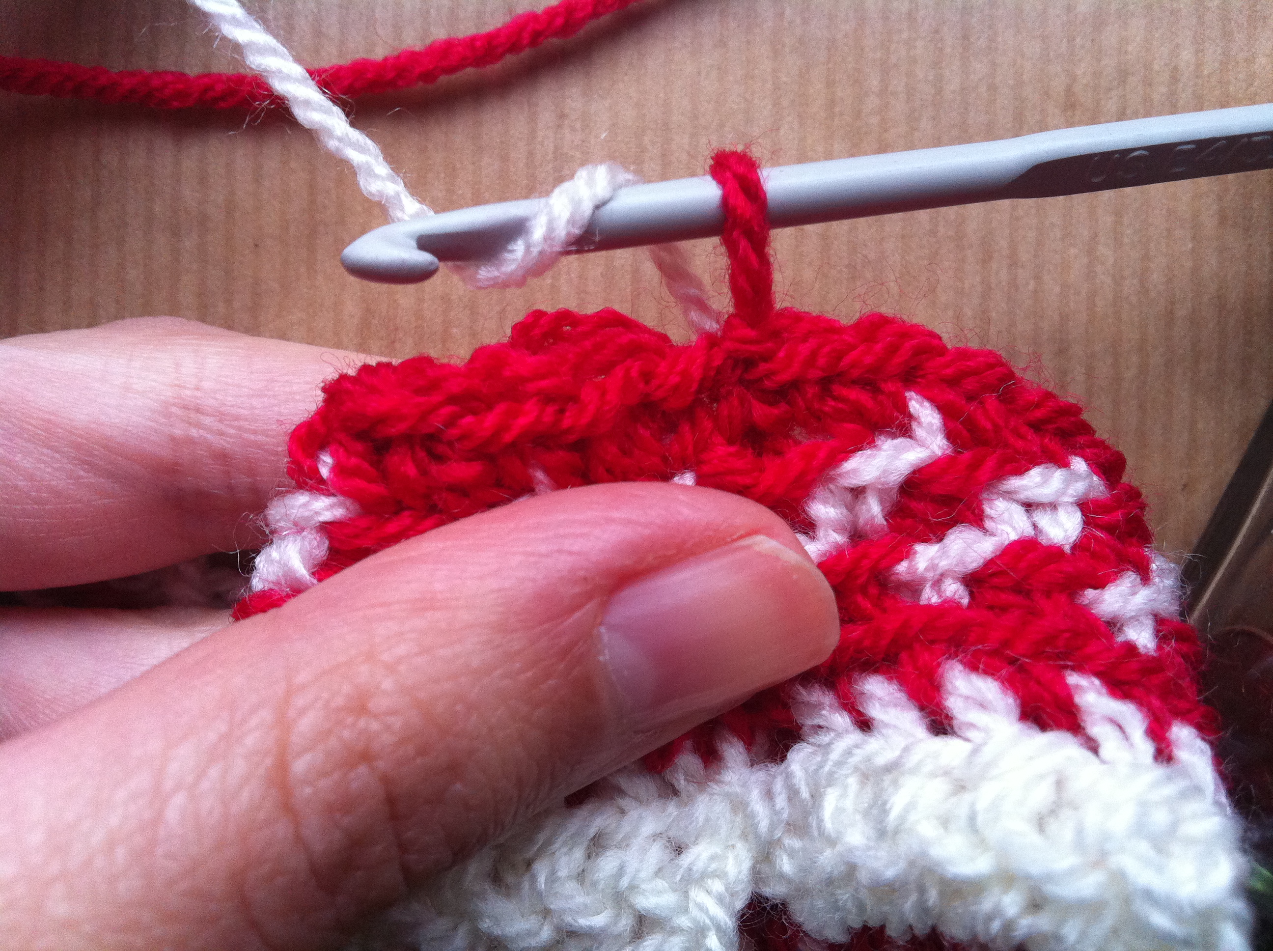 dc2tog: insert hook in stitch, yarn over and pull up a loop, insert hook in next stitch, yarn over and pull up a loop, yarn over and pull through 3 loops on hook.