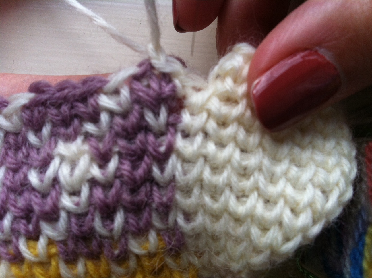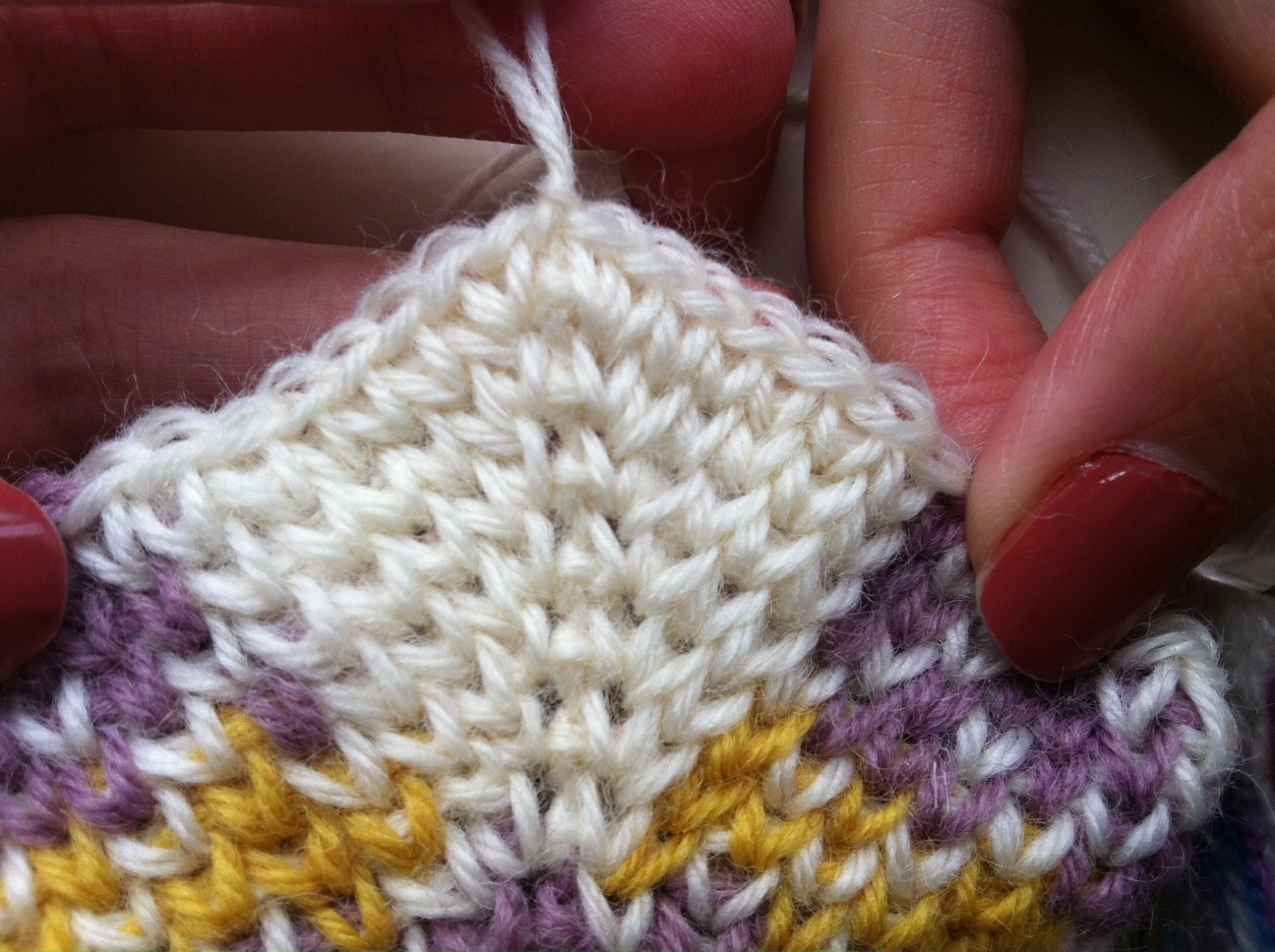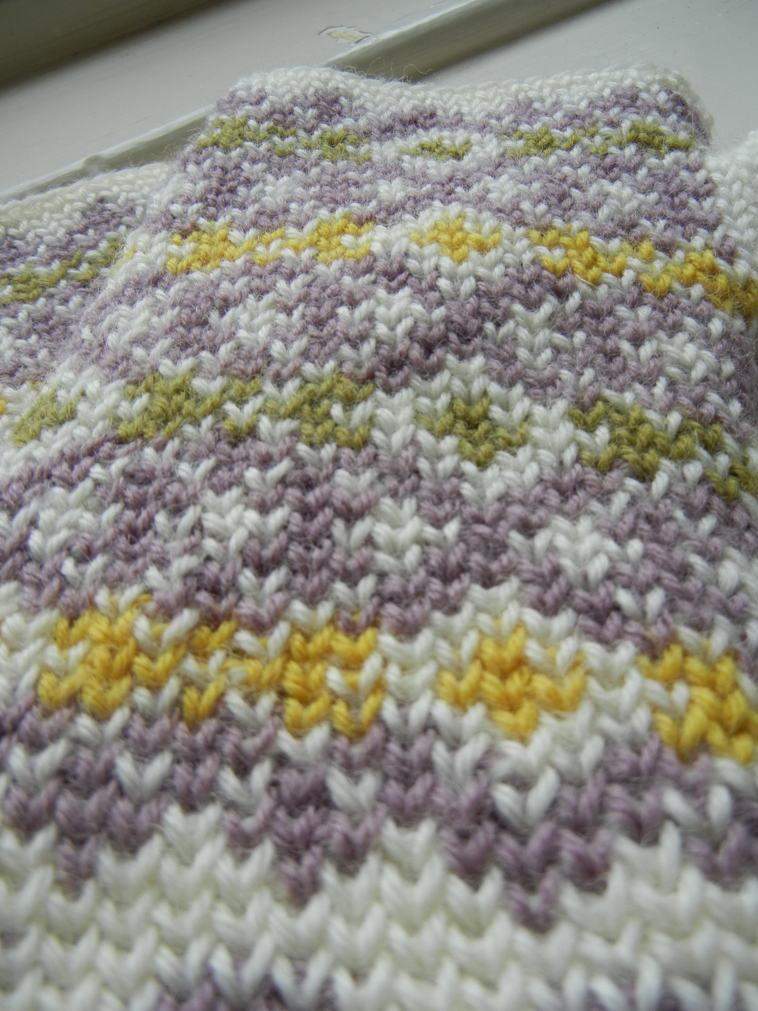 Now, the rows with the stitch pattern (with the bobbles) are very easy to do without thinking about them because there are no increases or decreases, and no matter in what part of the shawl you are a stitch pattern row will be a repeat of 6 stitches with just a couple of things to bear in mind.