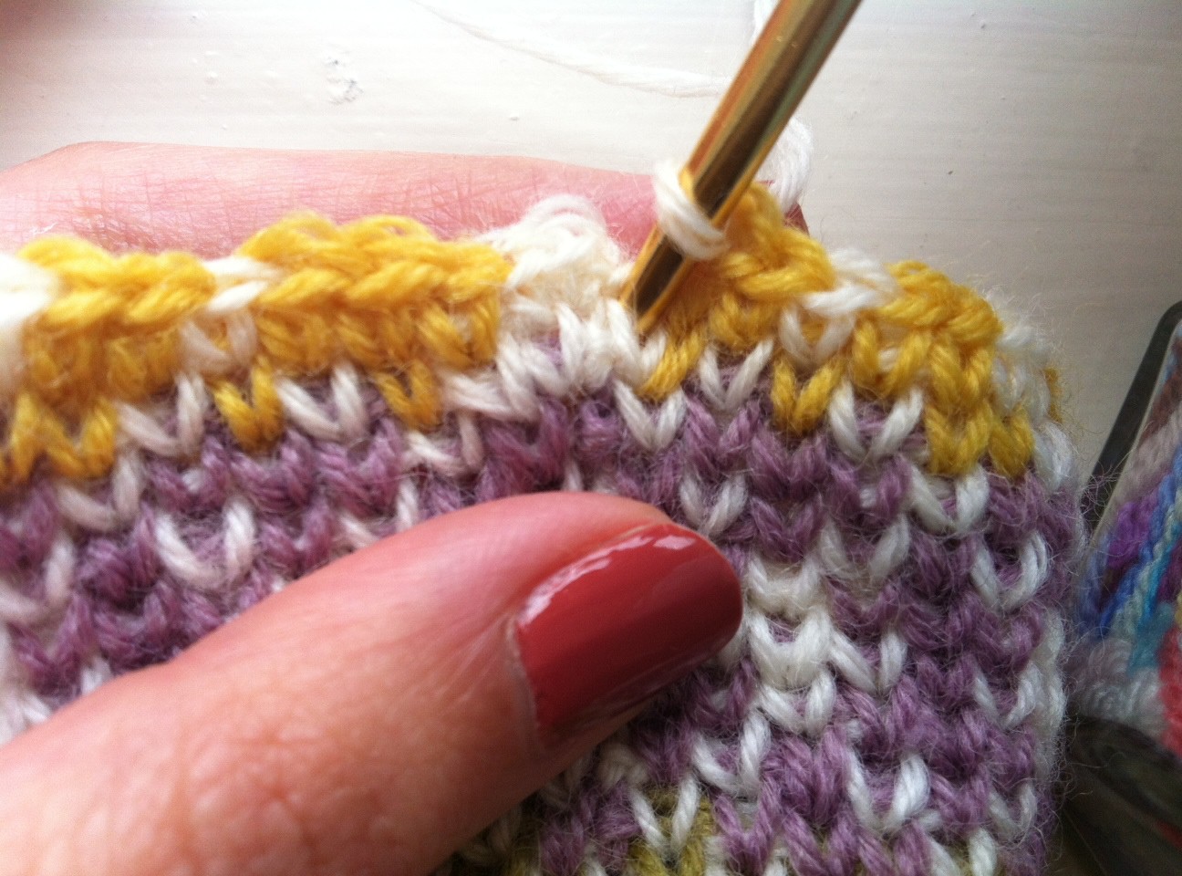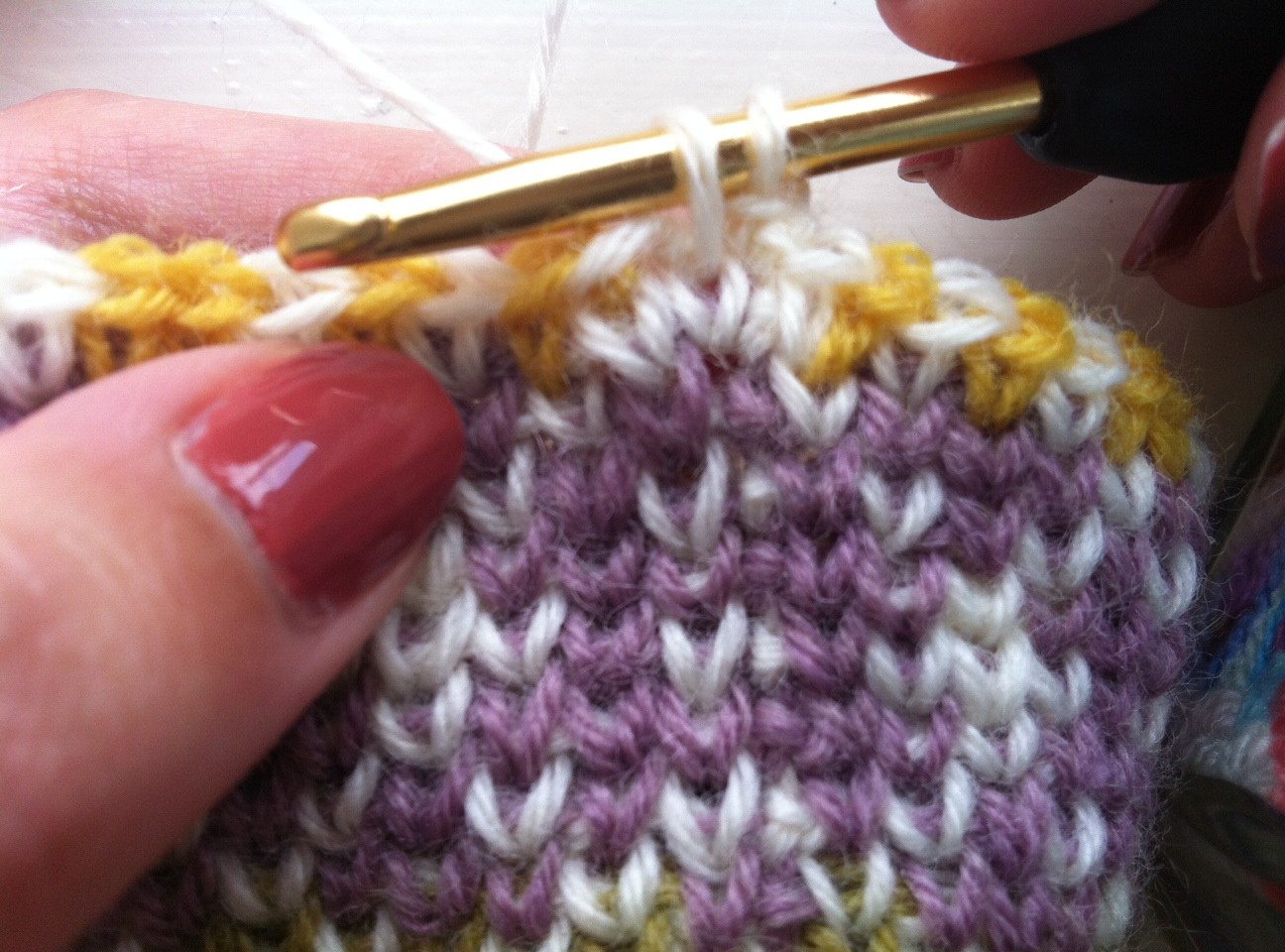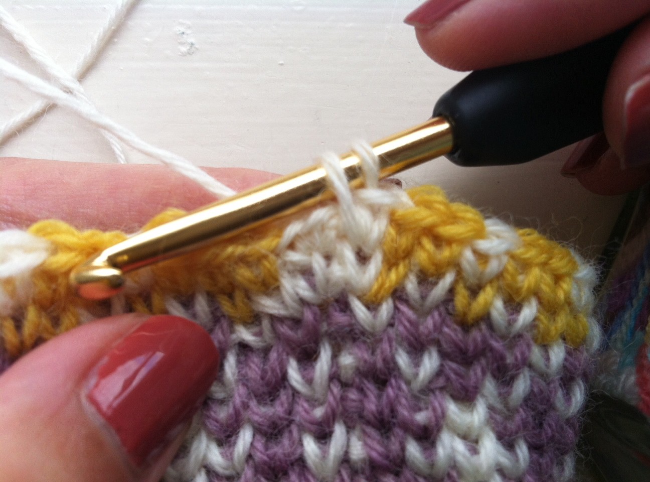 Row 1: ch 1, 1dc per row until middle of the shawl (Row 149), 3dc, 1dc per row until the end. Turn (301 sts). Don’t worry too much about where you do the dc and it is fine if you miss a row at some point, try to get the amount of stitches required to get the edge to match up better, though it is not the end of the world if it doesn’t 😉