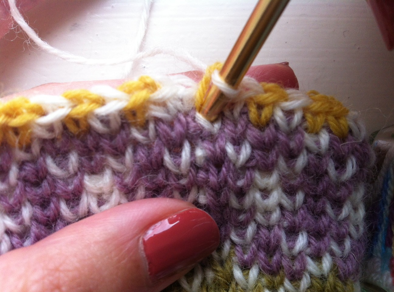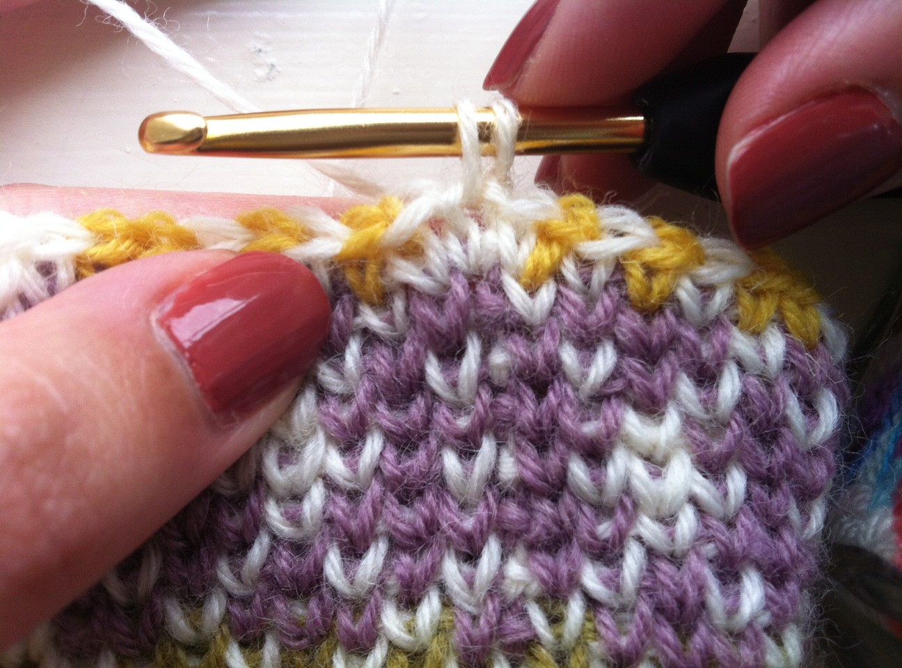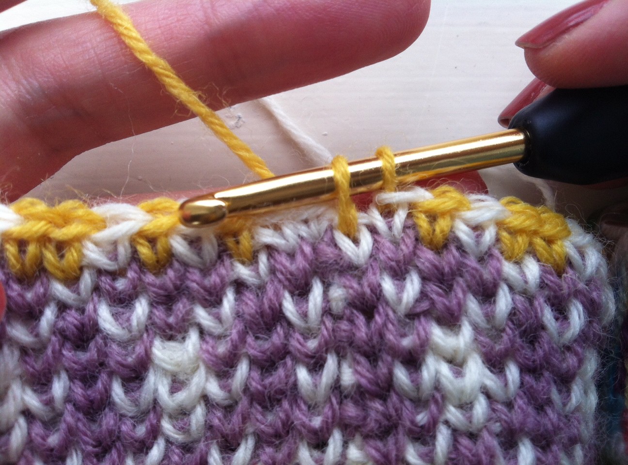 Row 1: ch 1, 1dc per row until middle of the shawl (Row 149), 3dc, 1dc per row until the end. Turn (301 sts). Don’t worry too much about where you do the dc and it is fine if you miss a row at some point, try to get the amount of stitches required to get the edge to match up better, though it is not the end of the world if it doesn’t 😉