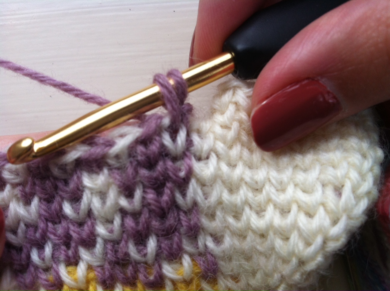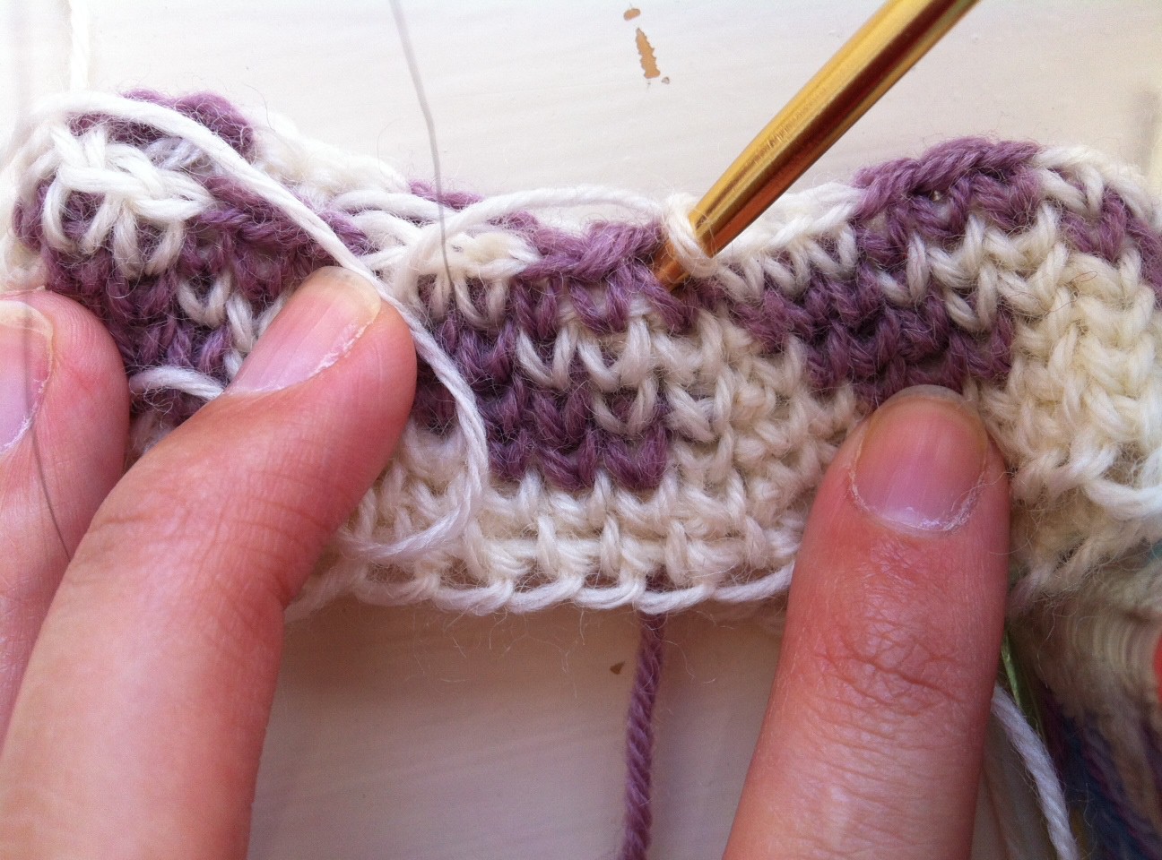 Let’s see the 6 stitches: dtr, dc, dtr, dc, dc, dc (or dtr, dc, dtr, 3dc). Now imagine you are in ANY row where you do the stitch pattern repeat: You always ch 1 and dc in first st. Now start your 6-stitch-repeat (dtr, dc, dtr, 3dc) all the way until you get to the last st. No matter in what part of the 6-stitch-repeat you ended up, dc in the last dc and turn for the next row (which in the increase section will be an increase row and in the decrease section will be a decrease row). So that is all: dc in first st, dc in last st, and fill the space in between with as many repeats of the 6-stitch-repeat as you can fit, no matter if the last repeat is not a full one.