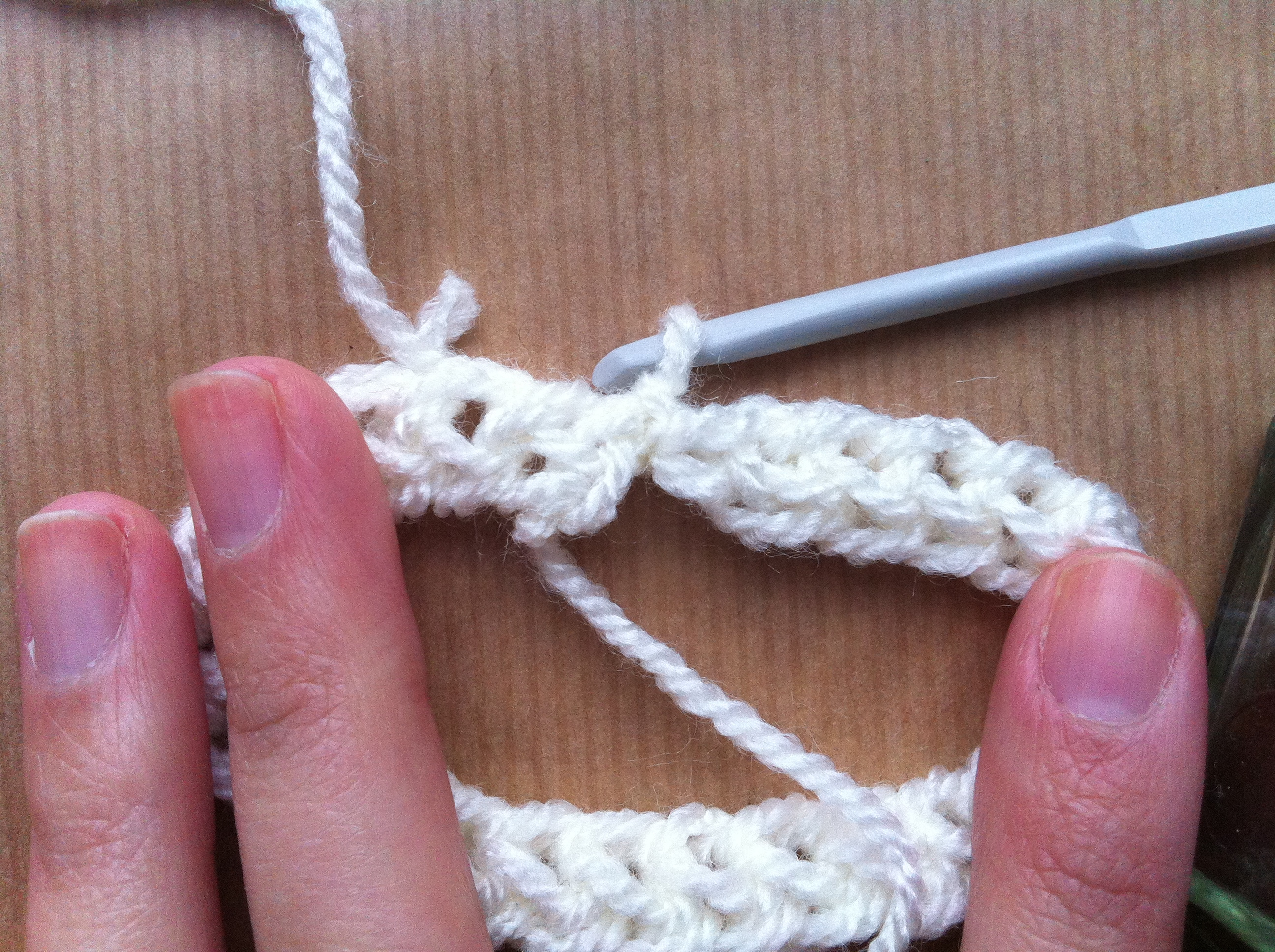 Row 3: ch 1, 2dc, 2dc in last dc. Turn (4st).