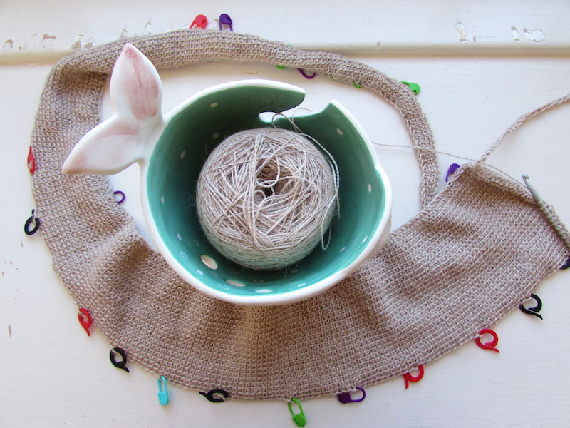 By the time you are done with that first row you need to make sure that you ended up with the almost 500 stitches stated in the pattern, which wasn’t easy to count. My advise is to count every 50 stitches and place a marker, that way when you lose your count you just have to begin again from the last marker and not from the beginning.